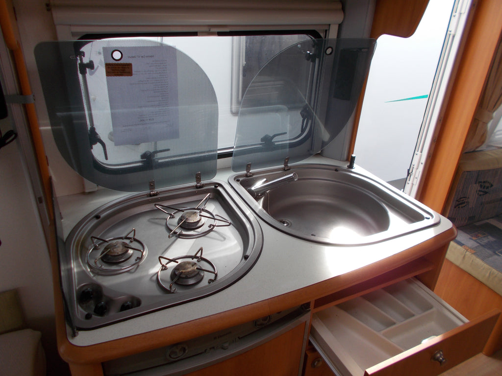 - Küche mit 3 Flammen Gaskocher, Spüle und Glasabdeckungen